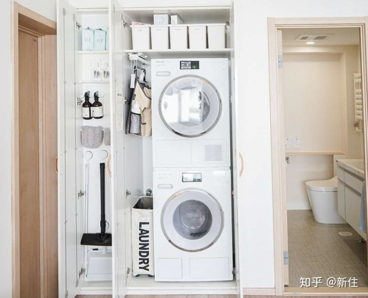 打開柜門才會發(fā)現(xiàn),連洗衣機、烘干機全都能藏進去。