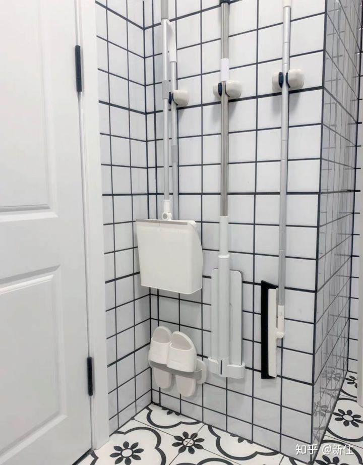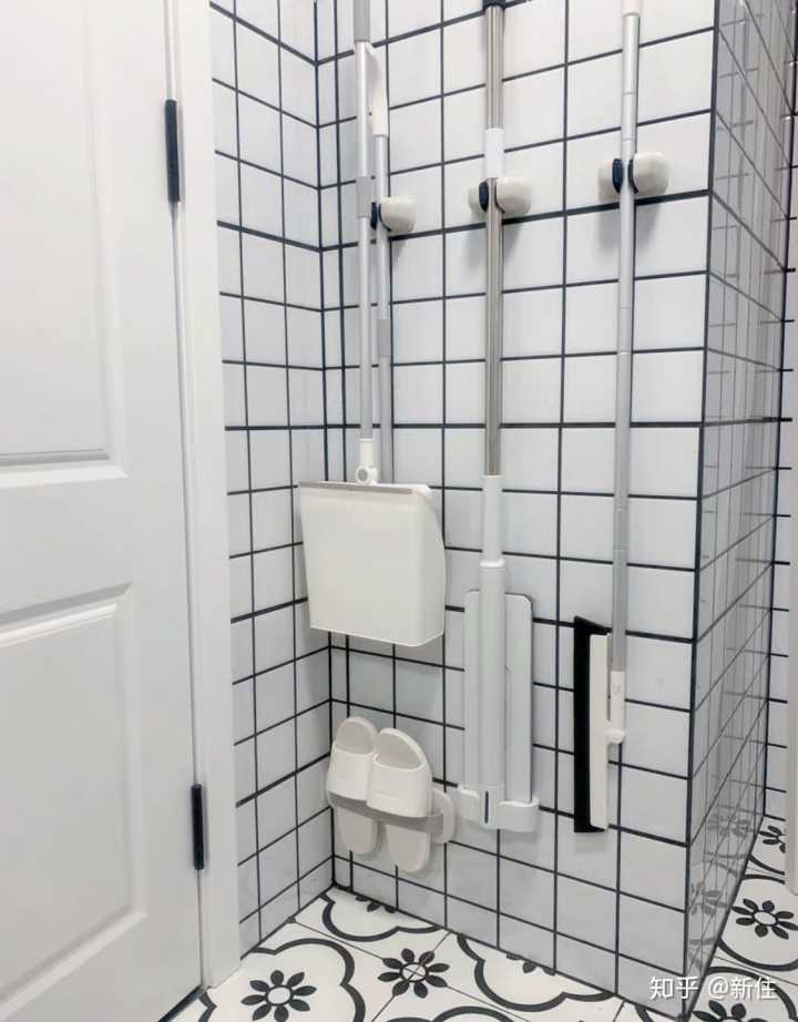對于家里沒清潔工具柜,想要整潔也是有方法的,可以通過拖把掛鉤來壁掛在衛(wèi)生間門后收納。