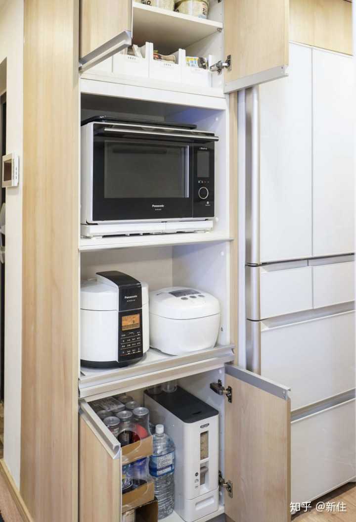 如果廚房空間足夠,定制高柜是不錯的方式,可以把常用小家電都收納起來不說,還非常方便使用。