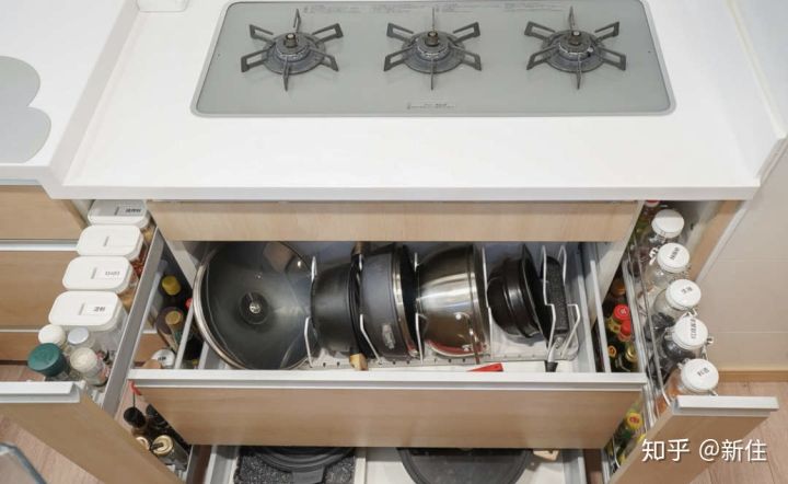 比如灶臺下做成大抽屜,收納家里各種鍋,兩側(cè)做成拉籃,正好可以放調(diào)料。