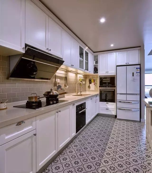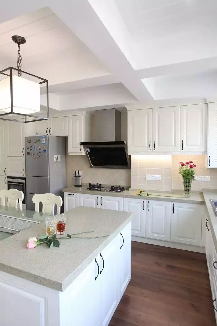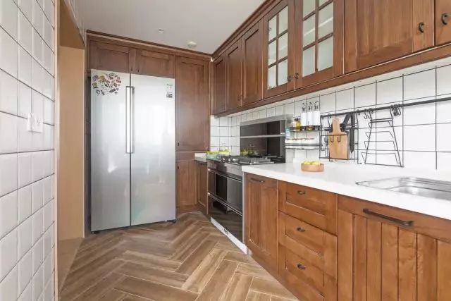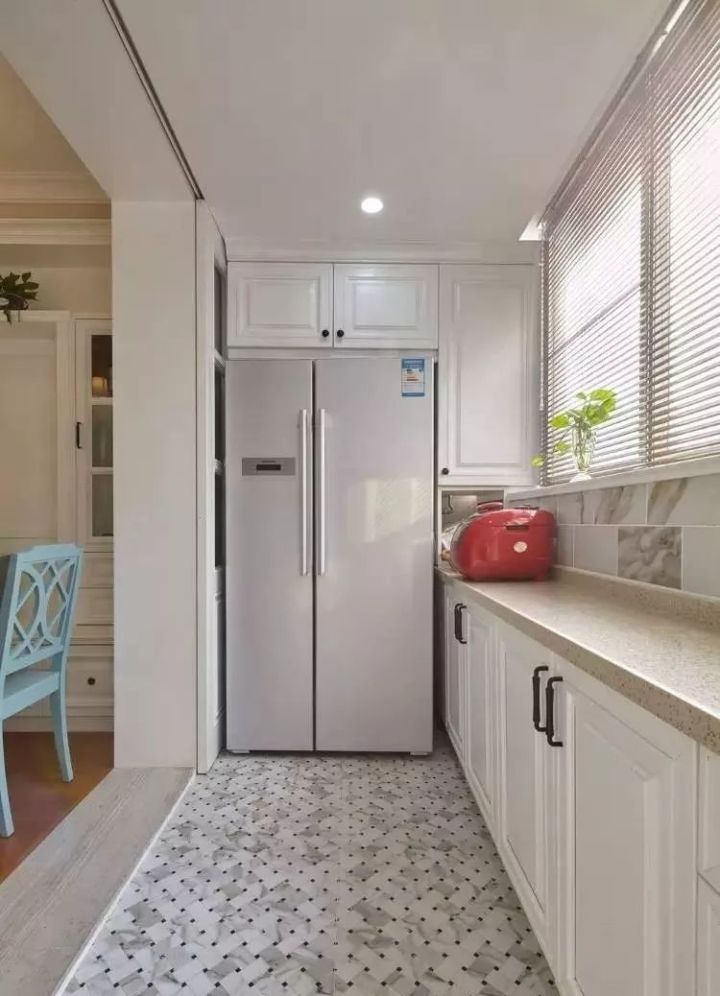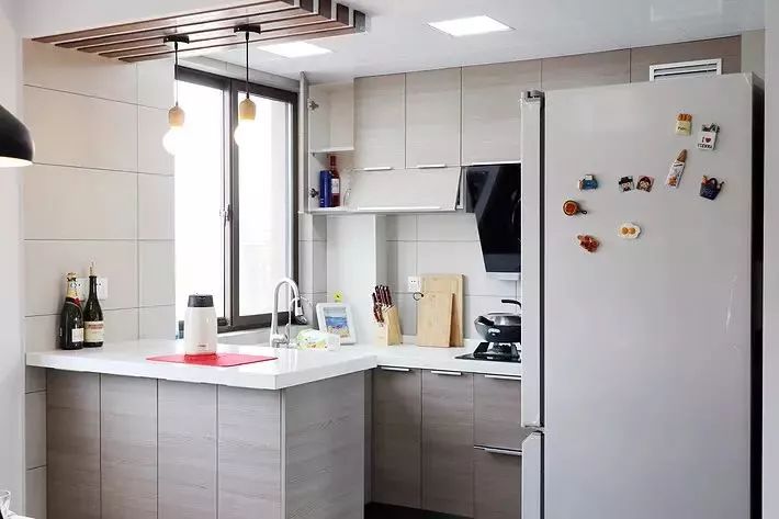 把冰箱“安裝”到櫥柜里面去,這就要求定做櫥柜的時候,提前為冰箱預(yù)留出尺寸,看到下圖了嗎?冰箱顯得會有點唐突,但好在櫥柜有點連貫性,也可以解決一部分收納問題。如下面幾個案例: