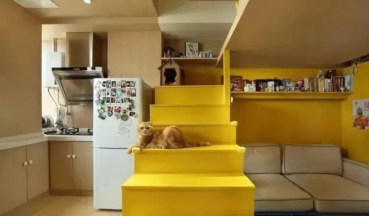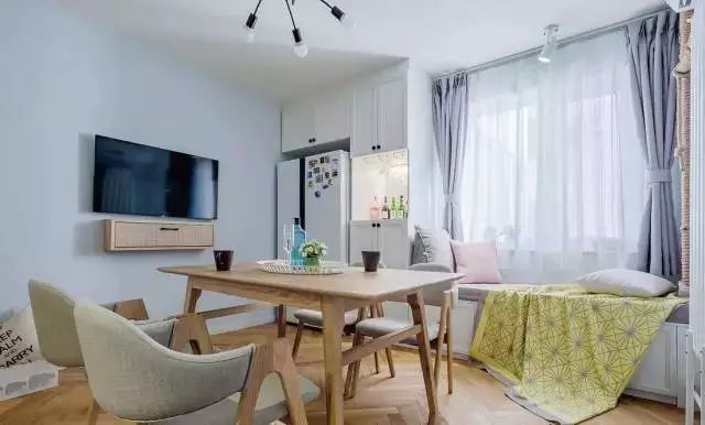 冰箱與柜體合為一體,相當節(jié)省空間??看暗牡胤降淖隽藗€榻榻米,等飯之余,靠著讀幾頁書也是挺不錯的。